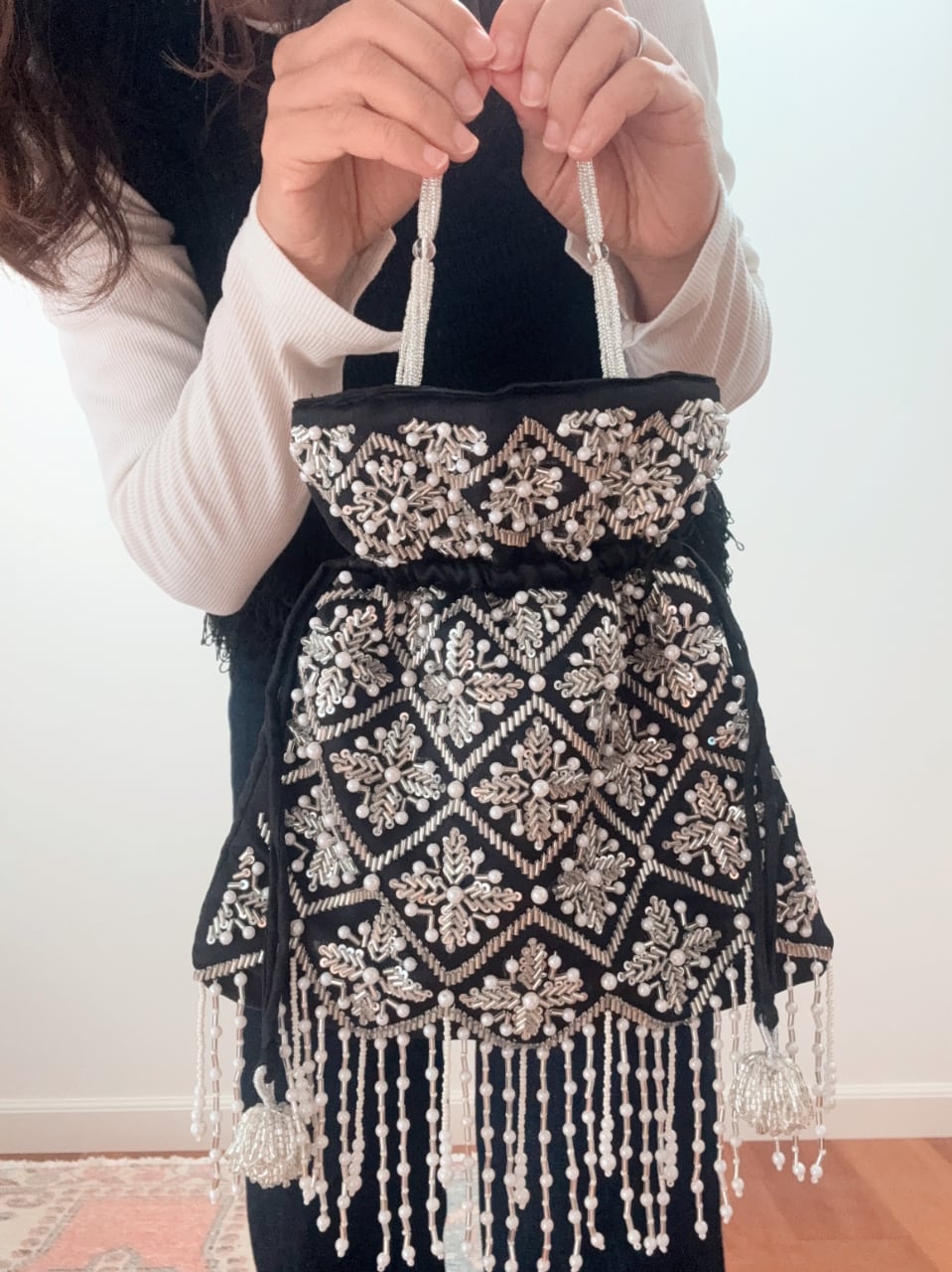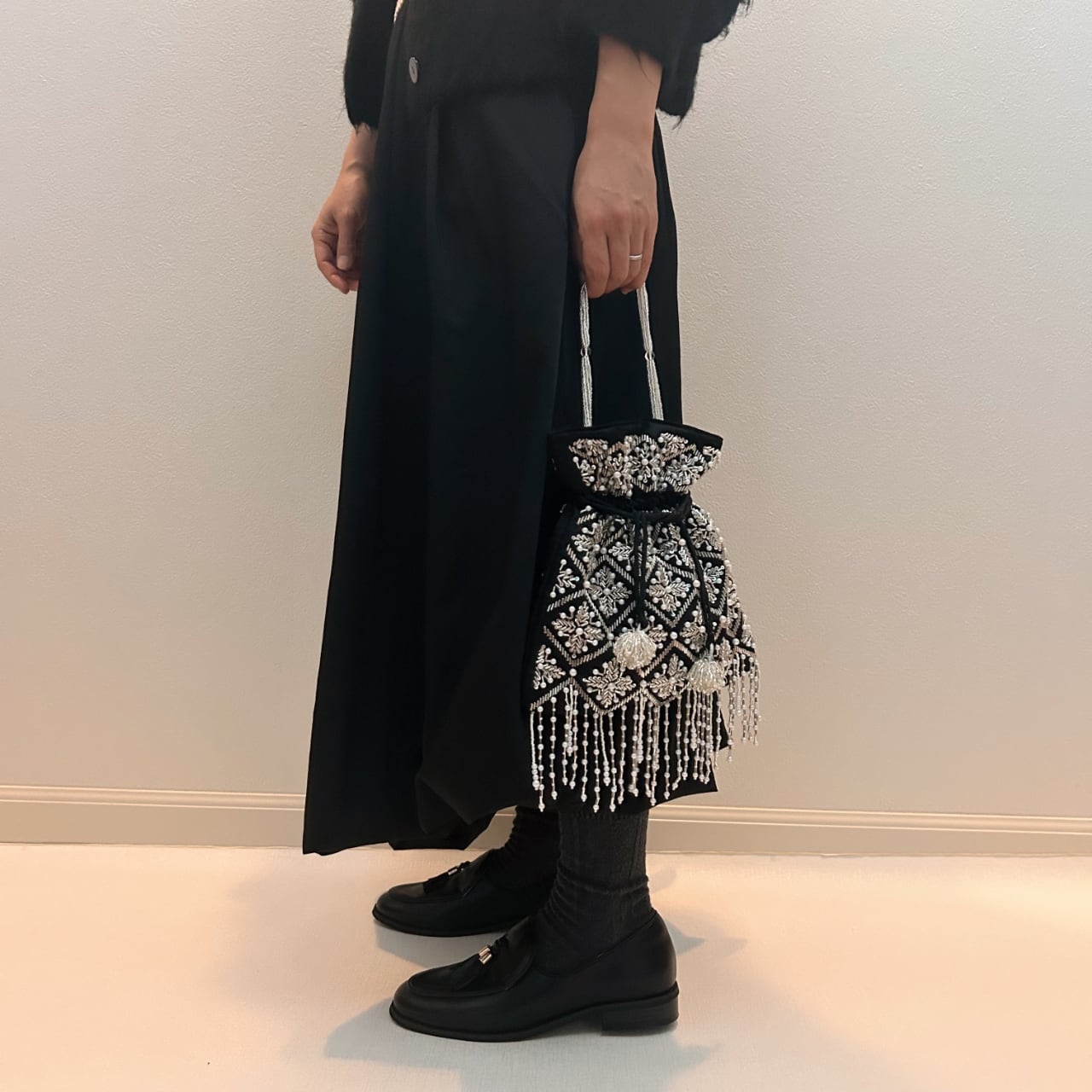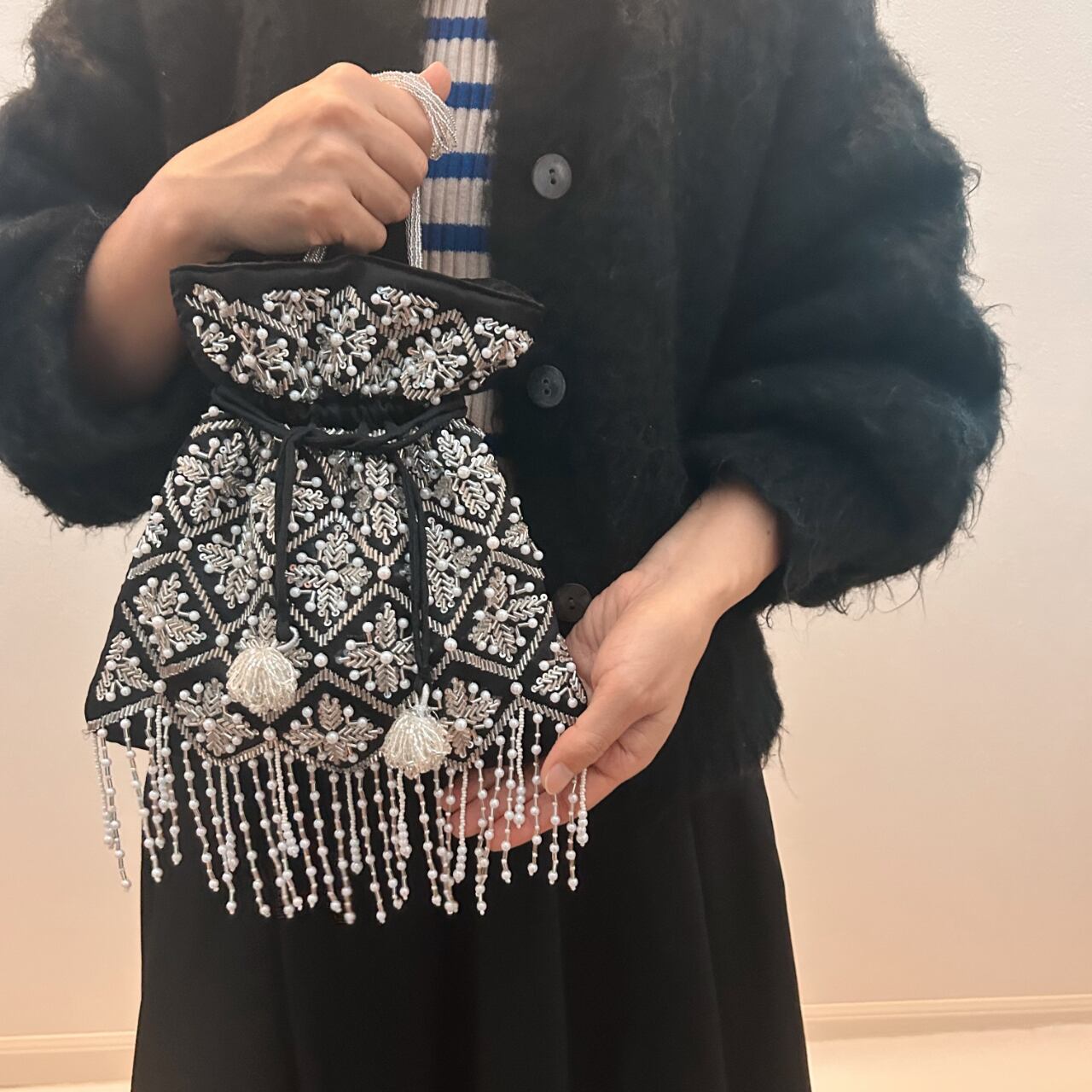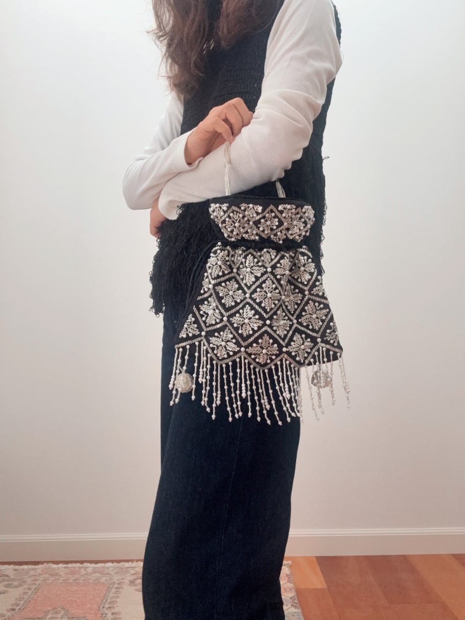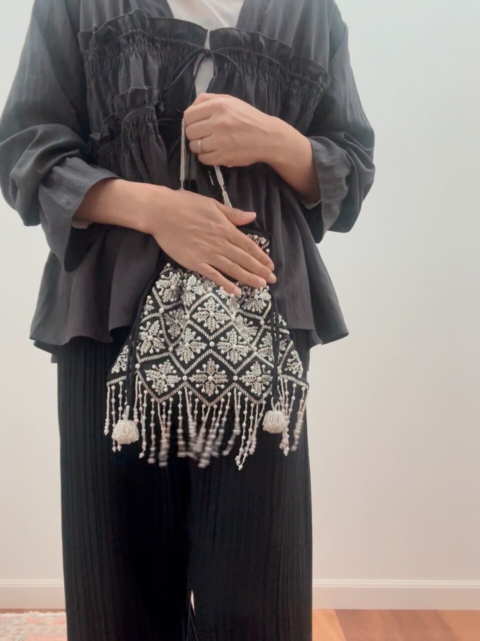 贅沢なほどの竹ビーズとフリンジが美しいポトリ【ブラック】