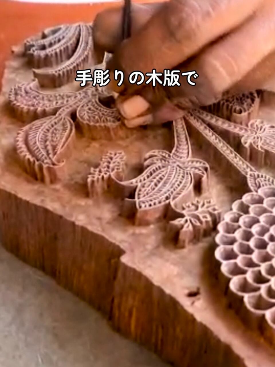 インドの職人さんが、染料をつけた木版を押し付けて模様を描いていきます。そのため、ブロックプリントならではのプリントのズレや濃淡、染料のハネなどがあります。
